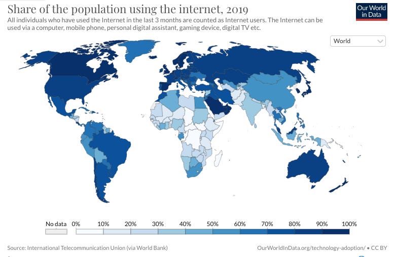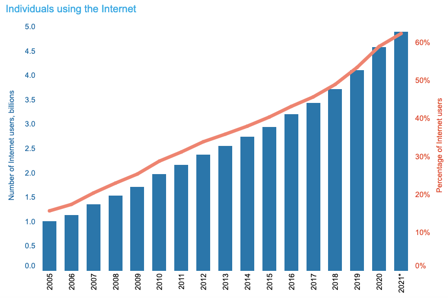 En el gráfico de abajo podrás ver que en el 2018 éramos alrededor de 3.7 billones de personas utilizando el internet (alrededor del 50% para ese año). Esta cifra aumentó considerablemente durante la pandemia. Sin embargo, actualmente todavía existe una gran cantidad de personas sin acceso a internet.
