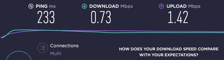 Nuevamente baja la latencia (233 ms) por la cercanía de México con Estados Unidos. ¿Y el ancho de banda apá? Todo mundo está usando este servidor.