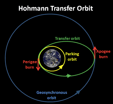 Gracias a Walter Hohmann, matemático alemán, sabemos que para pasar de una órbita circular más pequeña a una más grande o viceversa podemos usar una órbita elíptica intermedia con el menor delta V posible. Recuerda que delta V es el cambio en velocidad necesario para pasar de una órbita a otra.