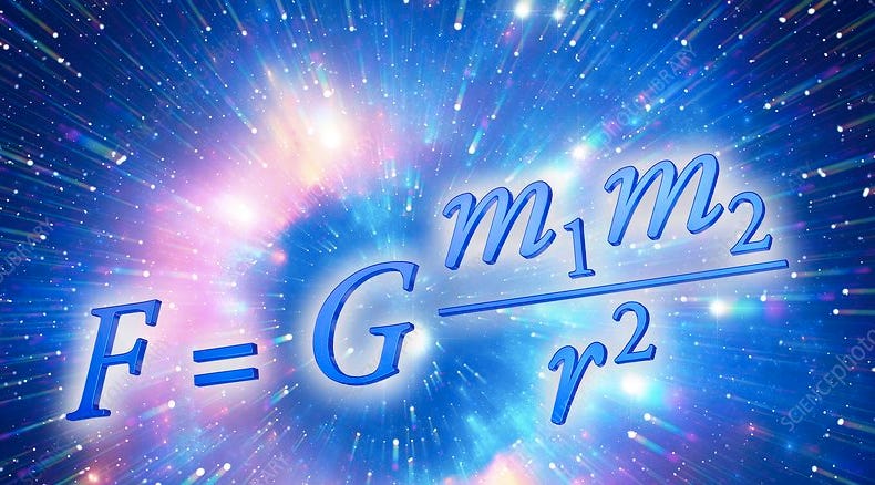 Para mí lo relevante en contribuciones espaciales es la ley de gravitación universal así como las tres leyes de Newton. La ley de gravedad explica cómo dos cuerpos se atraen proporcionalmente a sus masas e inversamente proporcional al cuadrado de sus distancias. G es la constante de gravitación universal; m1 y m2 son las masas de los cuerpos; y r es la distancia entre ellos en la fórmula de abajo.