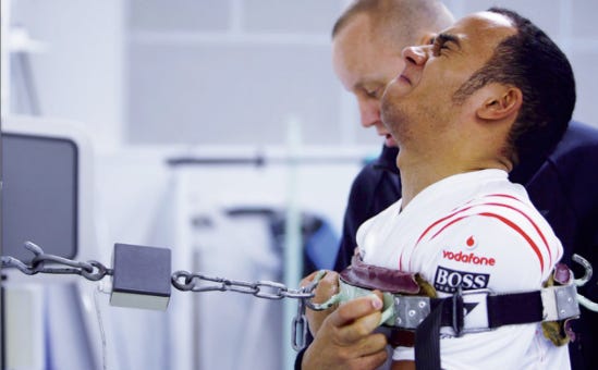 Mucha gente piensa que los pilotos de F1 no hacen ejercicio al estar sentados frente a un volante. Es totalmente falso. Los pilotos de Fórmula 1 se enfrentan, creo yo, al deporte más difícil del mundo. Parte de su entrenamiento se enfoca en desarrollar capacidad para soportar las tremendas fuerzas G durante las carreras.